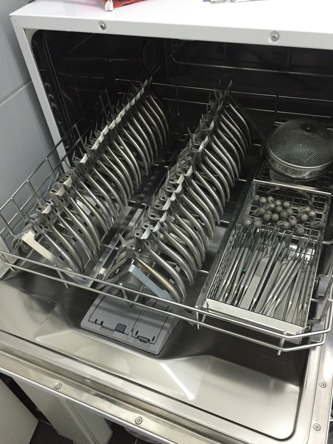 Ähnlich einer Geschirrspülmaschine werden unsere Instrumente über einen Zeitraum von ca. 90 Minuten mit hohen Temperaturen gereinigt. Hierbei wird jeder Prozessvorgang vom Spülen über Aufheizen, Reinigen, Temparaturüberwachung kontrolliert und auf USB Stick zur Dokumentation gespeichert. Jeder noch so kleine Fehler wird gemeldet und führt zum Programmabbruch.